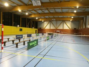 La séance de jeu libre de demain (dimanche 18/11) est annulée. En effet, la salle omnisports de la salle du collège Yves-Coppens sera occupée par le Trophée Départemental Jeunes. Vous pouvez toutefois venir encourager, coacher les jeunes du Trégor Badminton et pourquoi pas aider à la buvette. Photo de la salle :