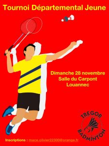 Trégor Badminton organise un tournoi jeune en Simple dans les catégories suivantes : poussin, benjamin, minime et cadet (année de naissance entre 2006 et 2012).Date : Dimanche 28 Novembre 2021Lieu : Complexe du Carpont, Rue des écoles à LouannecHeure : début des matchs à 9h, rdv à 8h30. Il n’est pas encore trop tard pour …