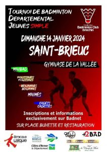TDJ de Saint-Brieuc Dimanche, 8 jeunes du club iront jouer à St Brieuc.Sont inscrits à ce tournoi : Paul, Maxime, Mehdi, Zakariya, Léo, Jules, Esteban et Ange.En savoir plus sur badnet. Tournoi Hélène Quenault – Loudéac Ce dimanche il y a également un tournoi simple à Loudéac pour les adultes.6 joueurs du club se sont …