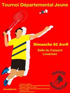 Le club organise un tournoi jeune en Simple dans les catégories suivantes : minibad/poussin, benjamin, minime et cadet (année de naissance entre 2007 et 2016).Date : Dimanche 02 Avril 2023Lieu : Complexe du Carpont, Rue des écoles à LouannecHeure : début des convocations 8h30. Besoin de bénévoles dès 8h. Il n’est pas trop tard pour …