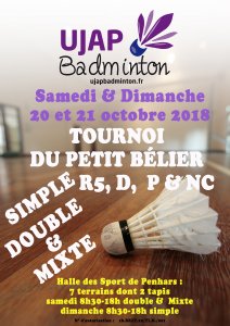 Le club de Quimper organise leur tournoi du petit bélier le 20 et 21 octobre 2018 Tournoi de simple, double et mixte séries R à NC info ici Merci de vous inscrire auprès de la commission compétition du club si vous êtes intéressé en envoyant un mail à competition@tregor-badminton.fr avec votre n° licence, classement, le …