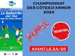 Championnat des Côtes d’Armor Il reste des places pour le championnat des Côtes d’Armor adulte 2024 les 1 et 2 juin 2024 !Les inscriptions sont possibles jusqu’au 24 Mai sur Badnet. Sont inscrits pour l’instant : Adrien, Christophe, Jules, Benjamin, Tristan, Nicolas, Simon, Long, Anaelle Tournoi de Plouha Il y a la nuit des Chacaux …