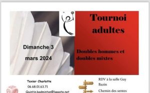 Groupama National Flame 56 5éme édition Maïwenn va jouer en simple au touroin d’Elven.Plus d’informations sur Badnet. Tournoi double et mixte QuintinTristan et Anaelle vont jouer en mixte au tournoi de Quintin.Long et Nicolas y seront pour le double homme.Plus d’informations sur Badnet. Tournoi FIB Tour Saint-Valentin VIVALTO SPORT (Saint-Grégoire) Paula va jouer à Saint-Grégoire …